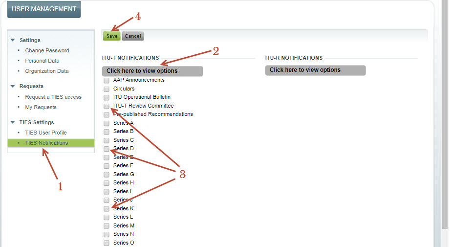 2. Under TIES Settings click on TIES Notifications (1). Expand the group of services you are interested in by clicking on "Click here to view options" button (2). Next, click on the categories for which you want to be notified for updates (3). Click on Save (4)
